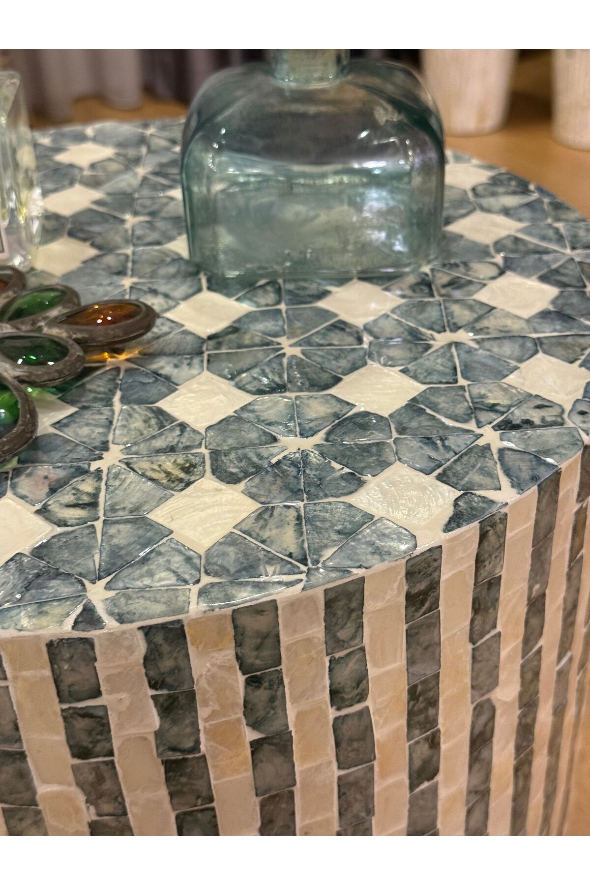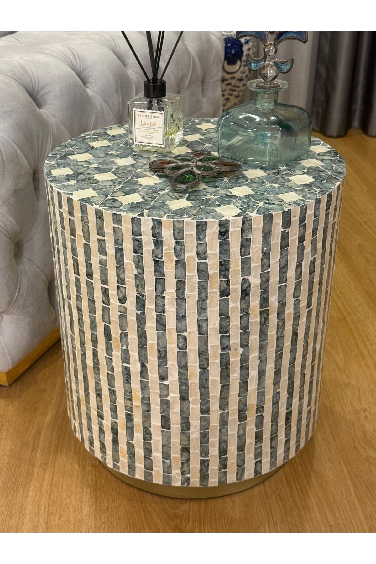 Modern ve zamansız tasarımıyla yaşam alanlarınıza sofistike bir dokunuş katan doğal taş mozaik kaplama silindir yan sehpa, hem dekoratif hem fonksiyonel kullanımıyla öne çıkar. El işçiliğiyle oluşturulan mozaik yüzeyi sayesinde her ürün kendine özgü ve benzersizdir.