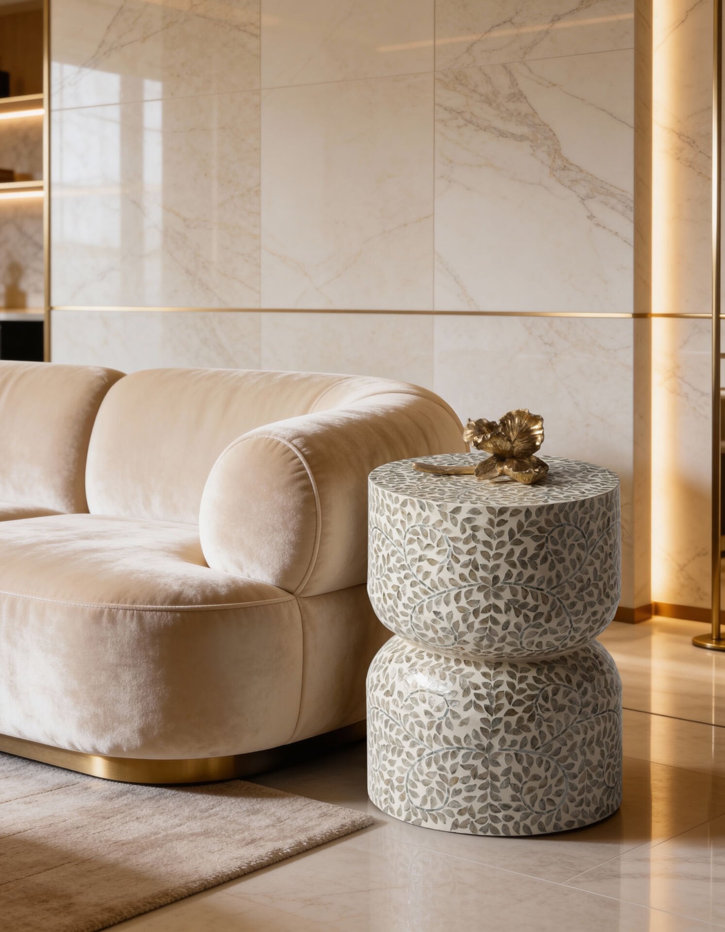 Salon, oturma odası, yatak odası veya antre kullanımına uygun olan bu şık yan sehpa; koltuk yanı sehpa, dekoratif sehpa veya tamamlayıcı mobilya olarak rahatlıkla tercih edilebilir. Doğal taş dokusu sayesinde lüks ve sıcak bir atmosfer yaratır.
