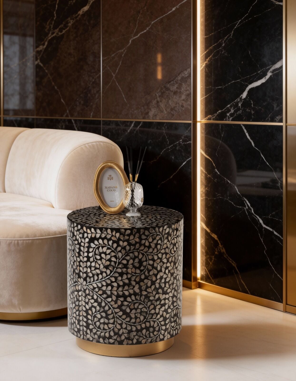 Salon, oturma odası, yatak odası veya antre kullanımına uygun olan bu şık yan sehpa; koltuk yanı sehpa, dekoratif sehpa veya tamamlayıcı mobilya olarak rahatlıkla tercih edilebilir. Doğal taş dokusu sayesinde lüks ve sıcak bir atmosfer yaratır.