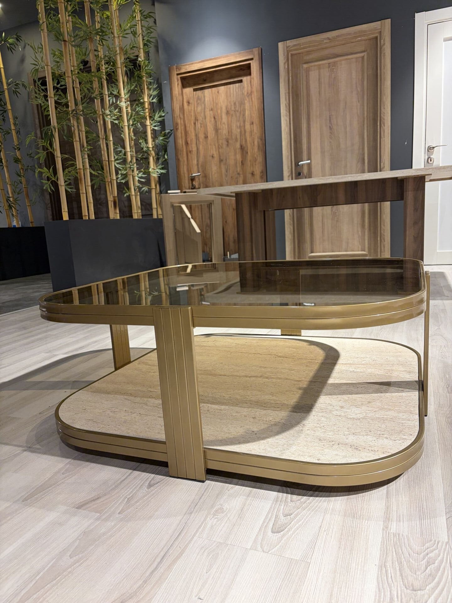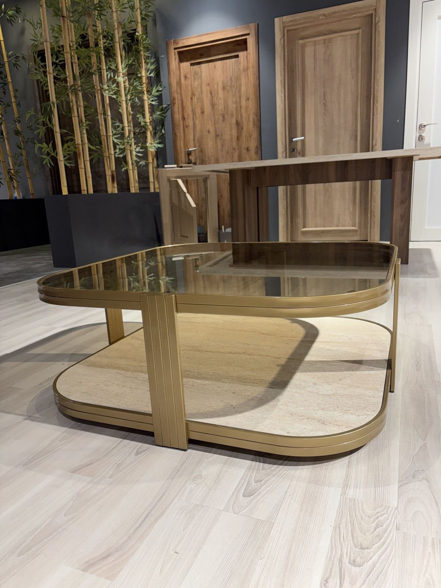 Valencia Orta Sehpa –Gold Eskitme Temperli Füme Cam & Metal Gövde Modern Tasarım 90×90 cm